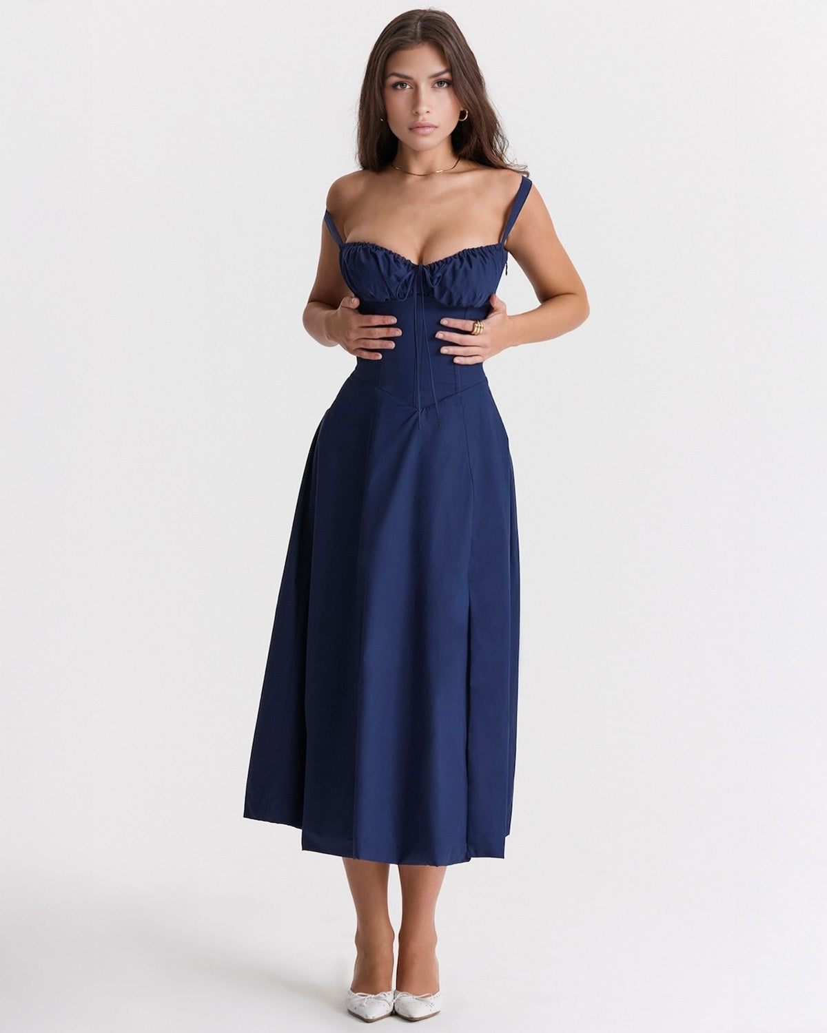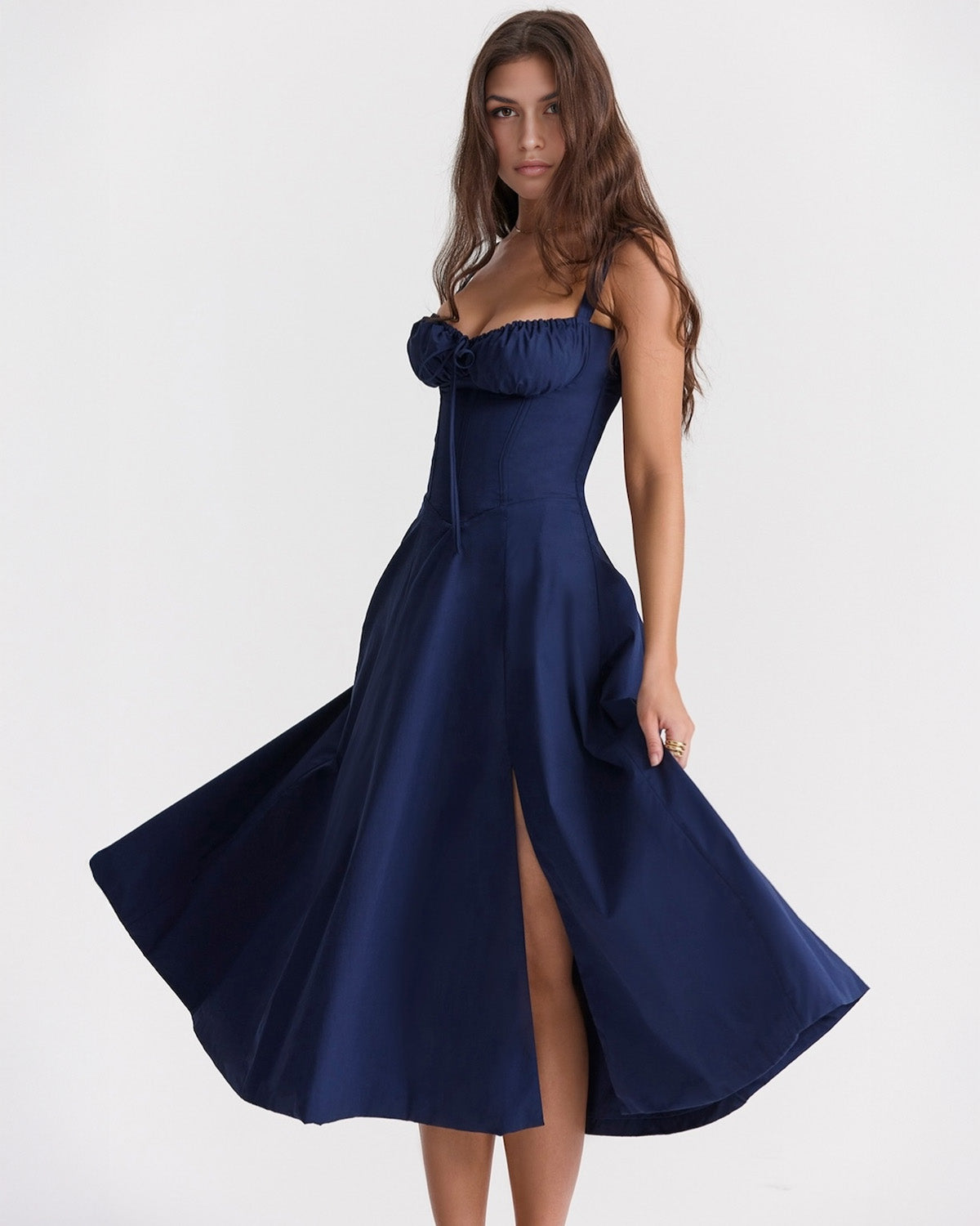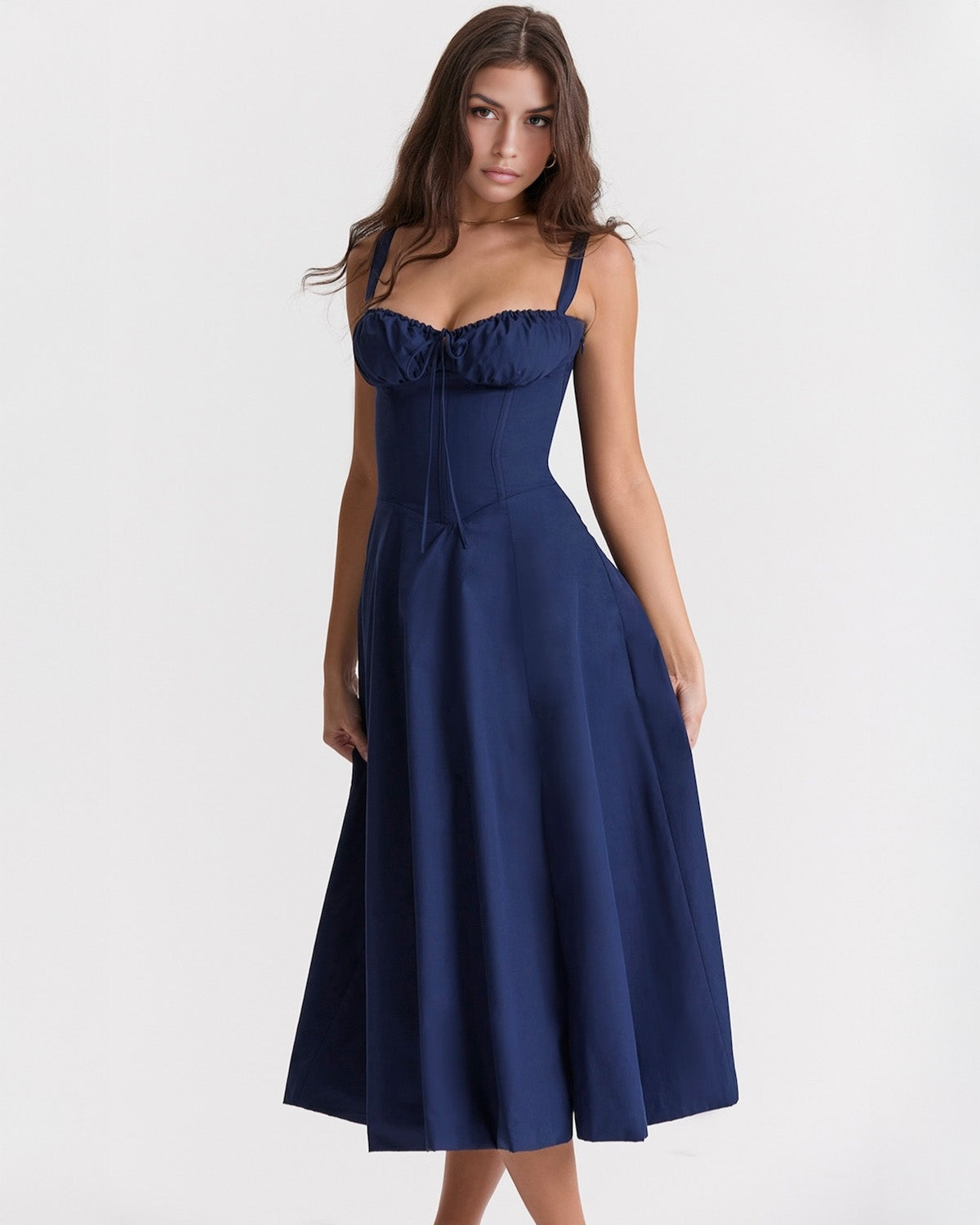 You'll feel ultra feminine in our 'Aurora' dress that's the perfect match for spring and summer garden parties. It's cut from stretch cotton in a gorgeous buttercup and has a corseted bodice to cinch the fit with a beautiful lace up back. The gathered bust has a drawstring tie and the side split adds a little sexiness to reveal a flash of leg.